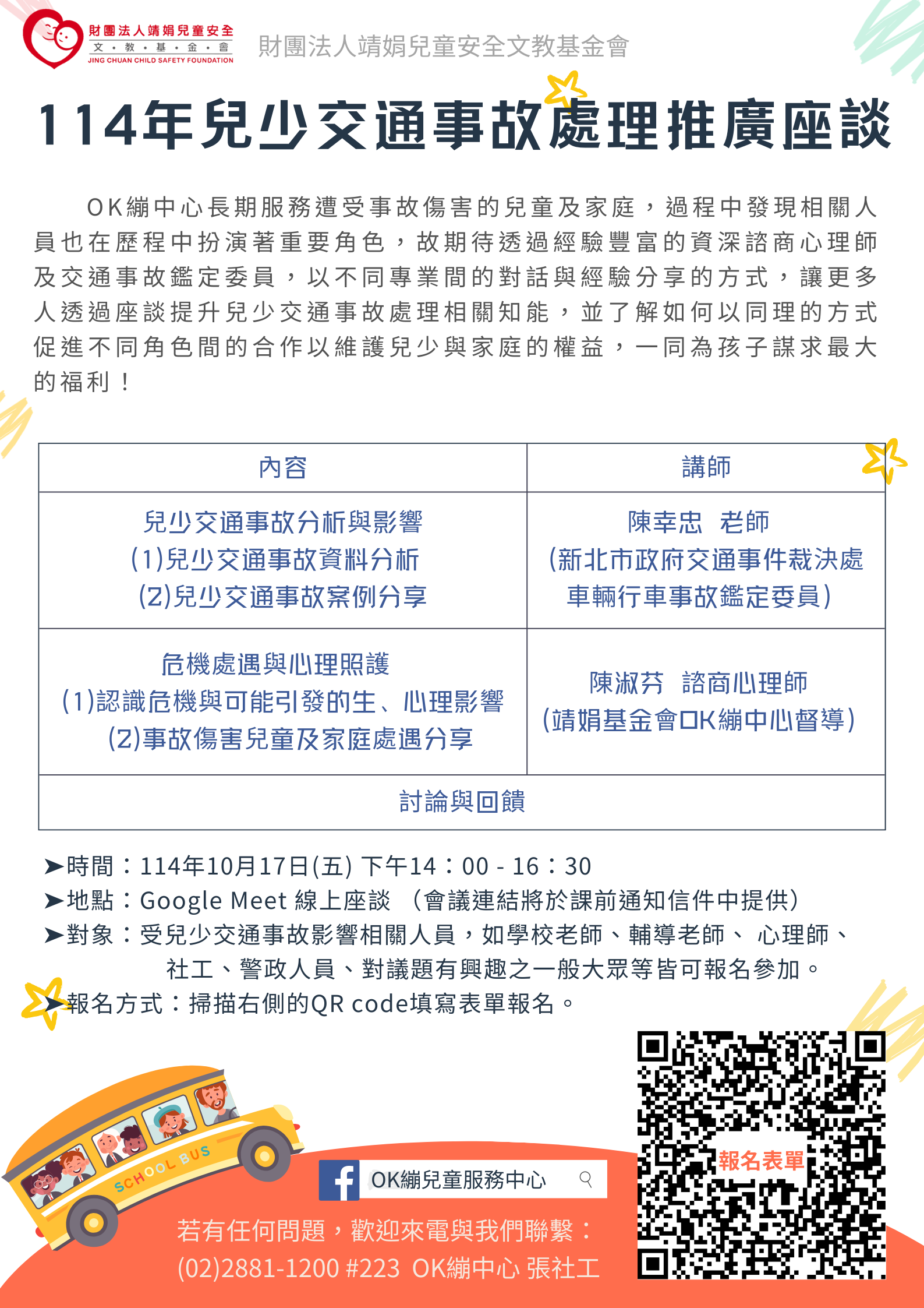 二、靖娟基金會OK繃兒童服務中心將於114年10月17日14時至16 時30分辦理兒少交通事故處理推廣線上座談,期待透過對 話方式交通、心理、社會等角度分享中心協助處理交通事 故的服務經驗傳達給更多相關工作者,讓不同專業之間以 同理的態度更了解彼此,一同協助為孩子謀取最大的利 益。
