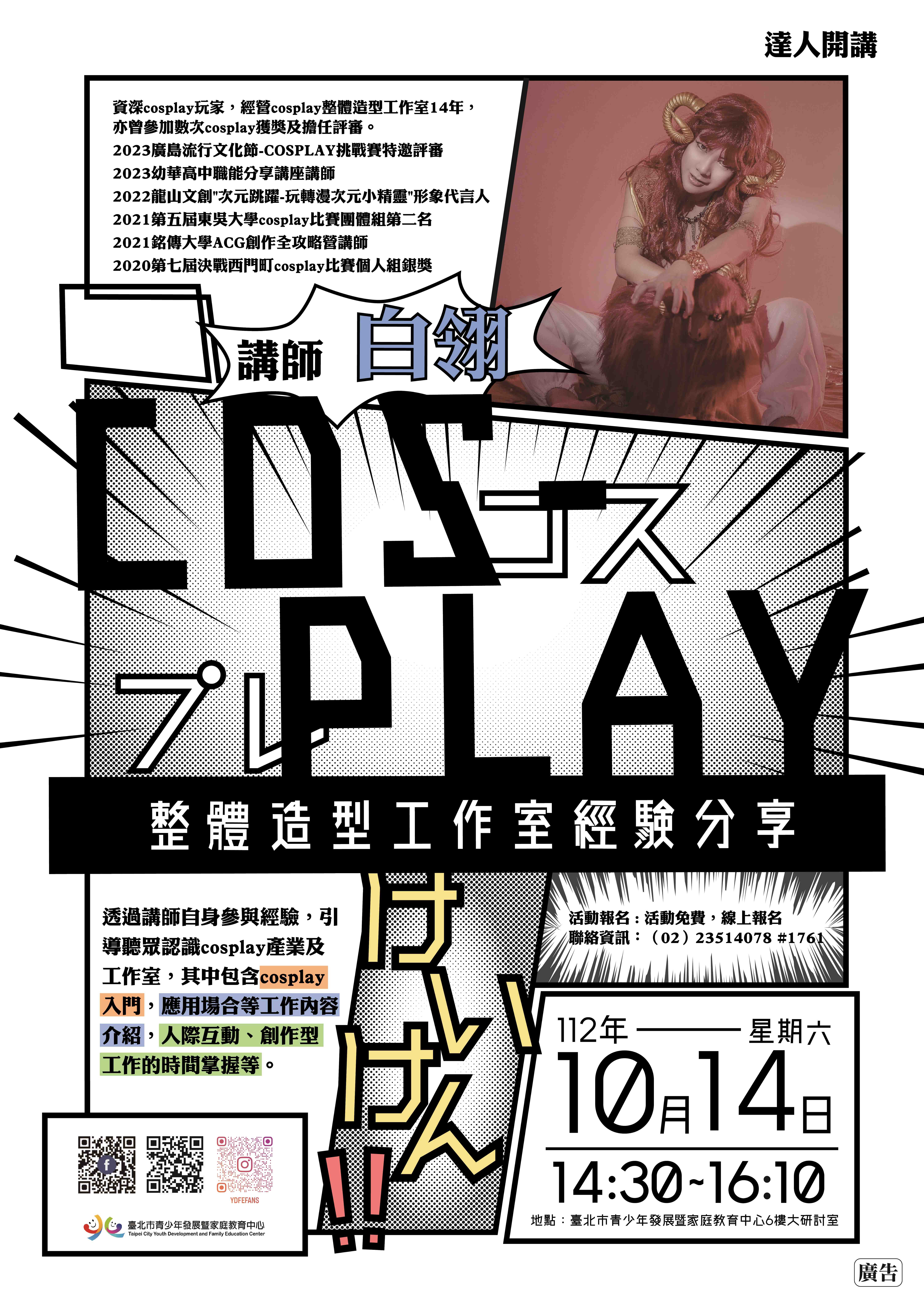 (二)60字:臺北市青少年發展暨家庭教育中心10月14日14:30 舉辦達人開講:Cosplay整體造型工作室經營分享,白翎 與您分享她經營Cosplay整體造型工