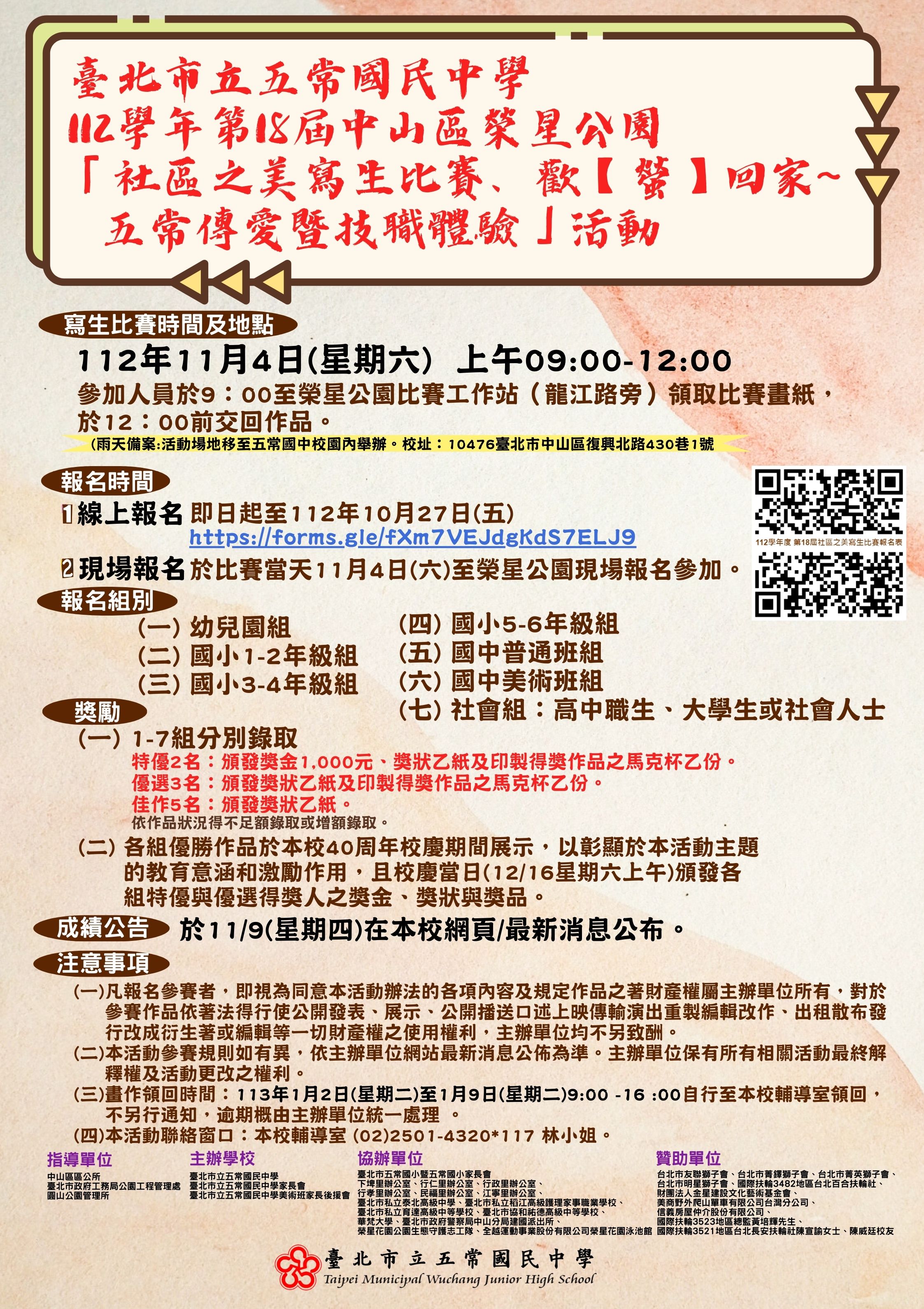 二、比賽地點:榮星公園內(臺北市中山區民權東路三段與龍 江路口),若遇雨天照常舉行,比賽地點移至五常國中(臺 北市中山區復興北路430巷1號)校內。