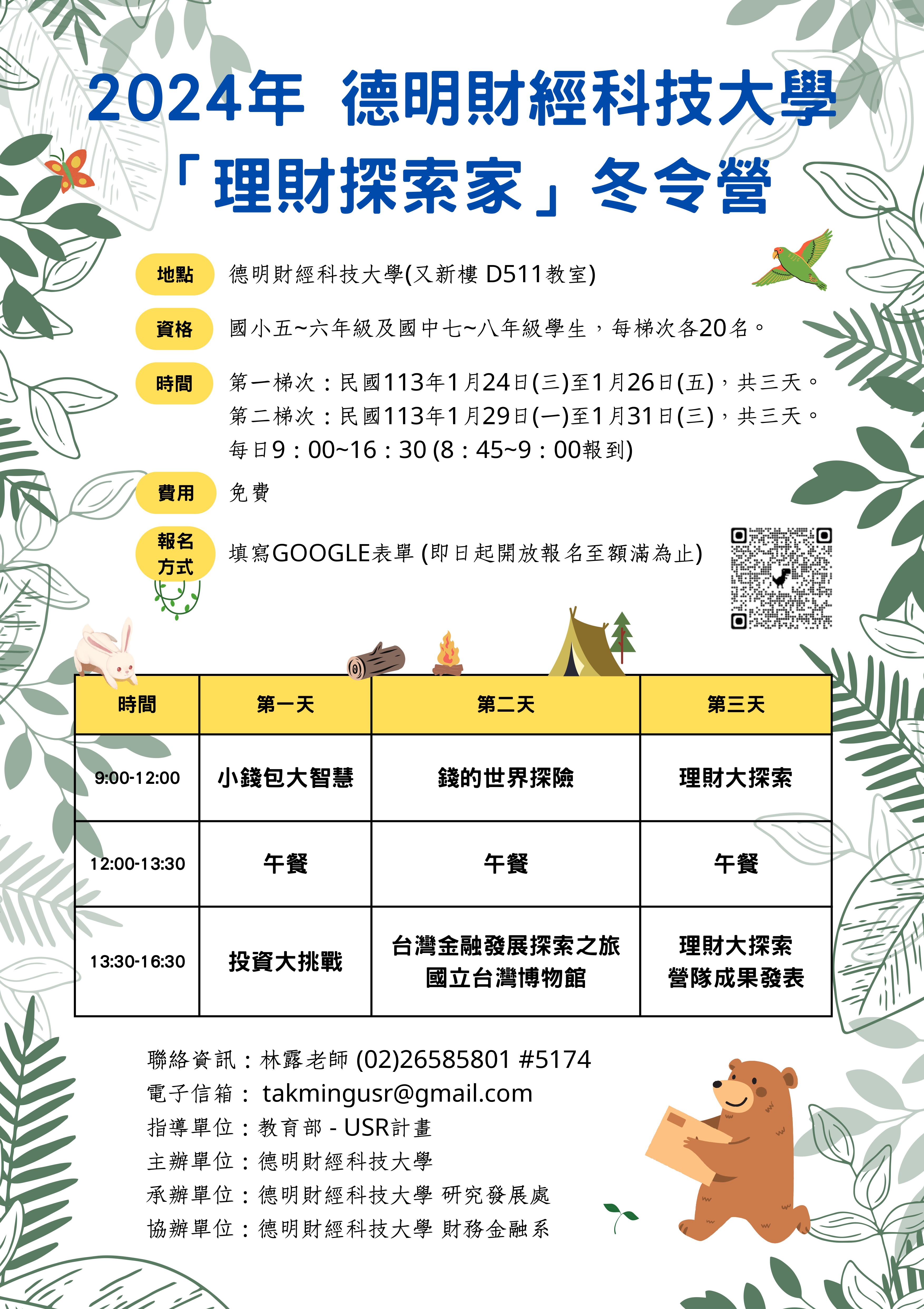 四、倘有疑義,請洽活動聯絡人林露老師,電話02-26585801分 機5174,電子信箱: takmingusr@gmail.com。
