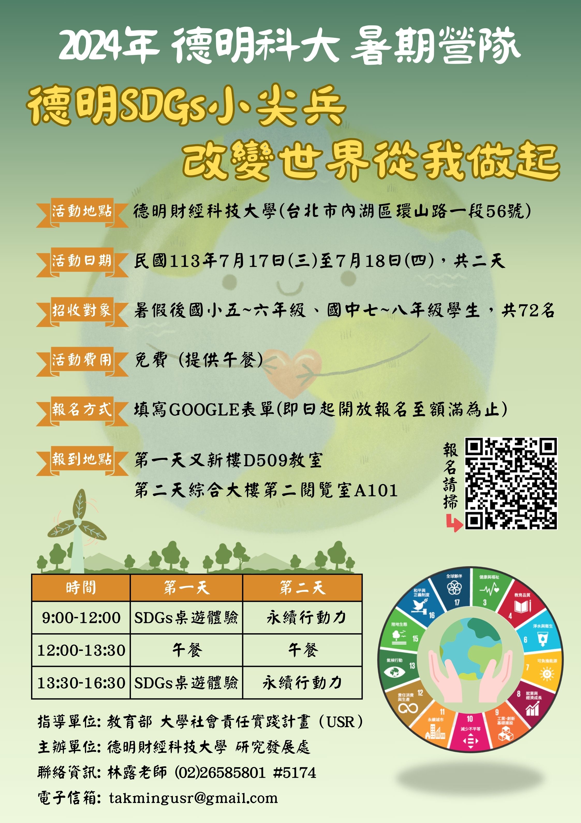 四、檢附營隊簡章及宣傳海報電子檔各1份,若有問題,請洽活 動聯絡人:林露老師,電話:02-26585801轉5174,電子信 箱:takmingusr@gmail.com。